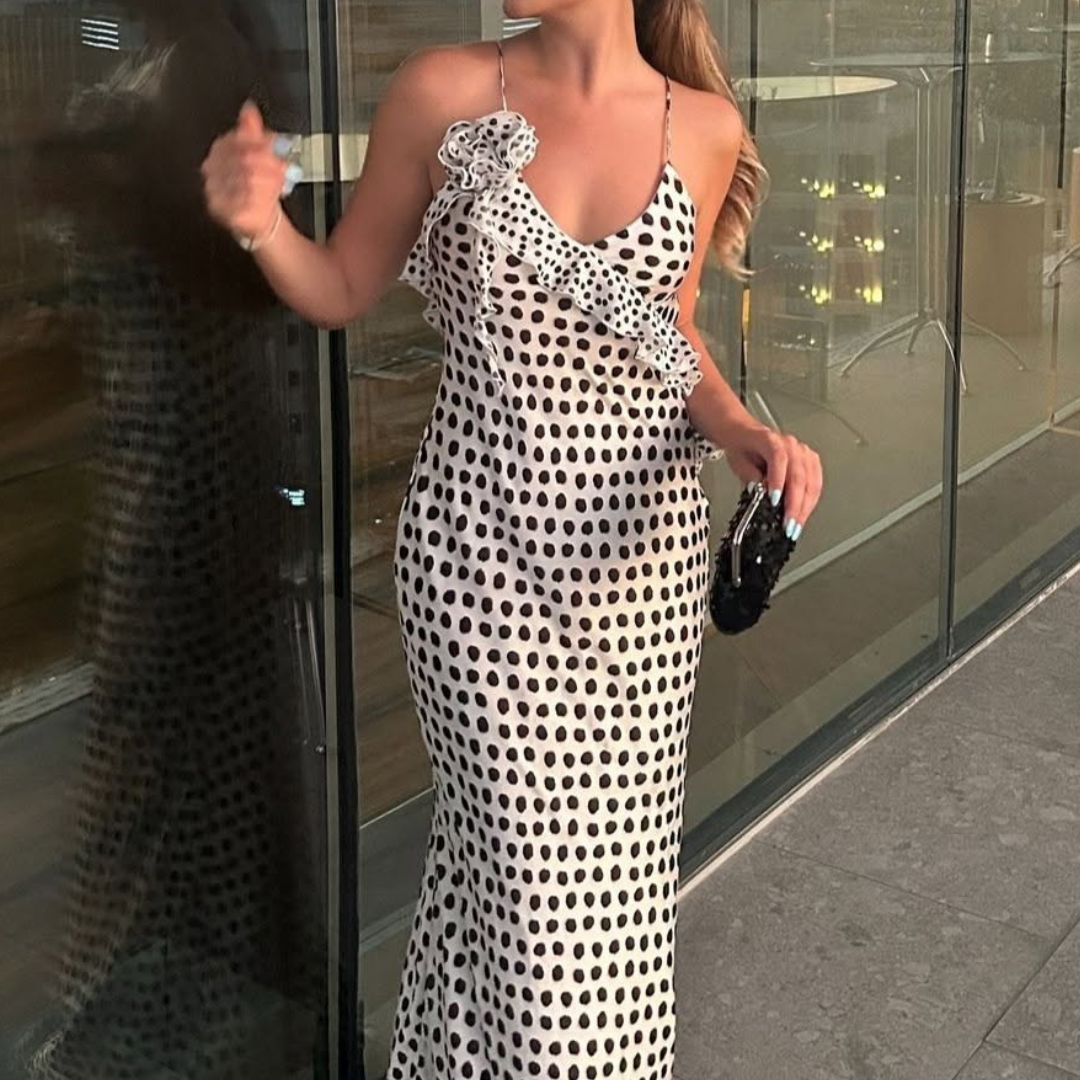 Make a bold style statement with the Amalia Maxi Dress, designed for women who embrace both elegance and modern trends. Featuring ultra-trendy ruffles that frame the neckline and a playful yet sophisticated polka dot print, this dress effortlessly combines charm and style.