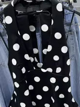 This black polka dot women’s top is the perfect piece for a chic yet sexy summer look. The halter neckline enhances the shoulders and posture, while the open back with decorative bow subtly draws attention.