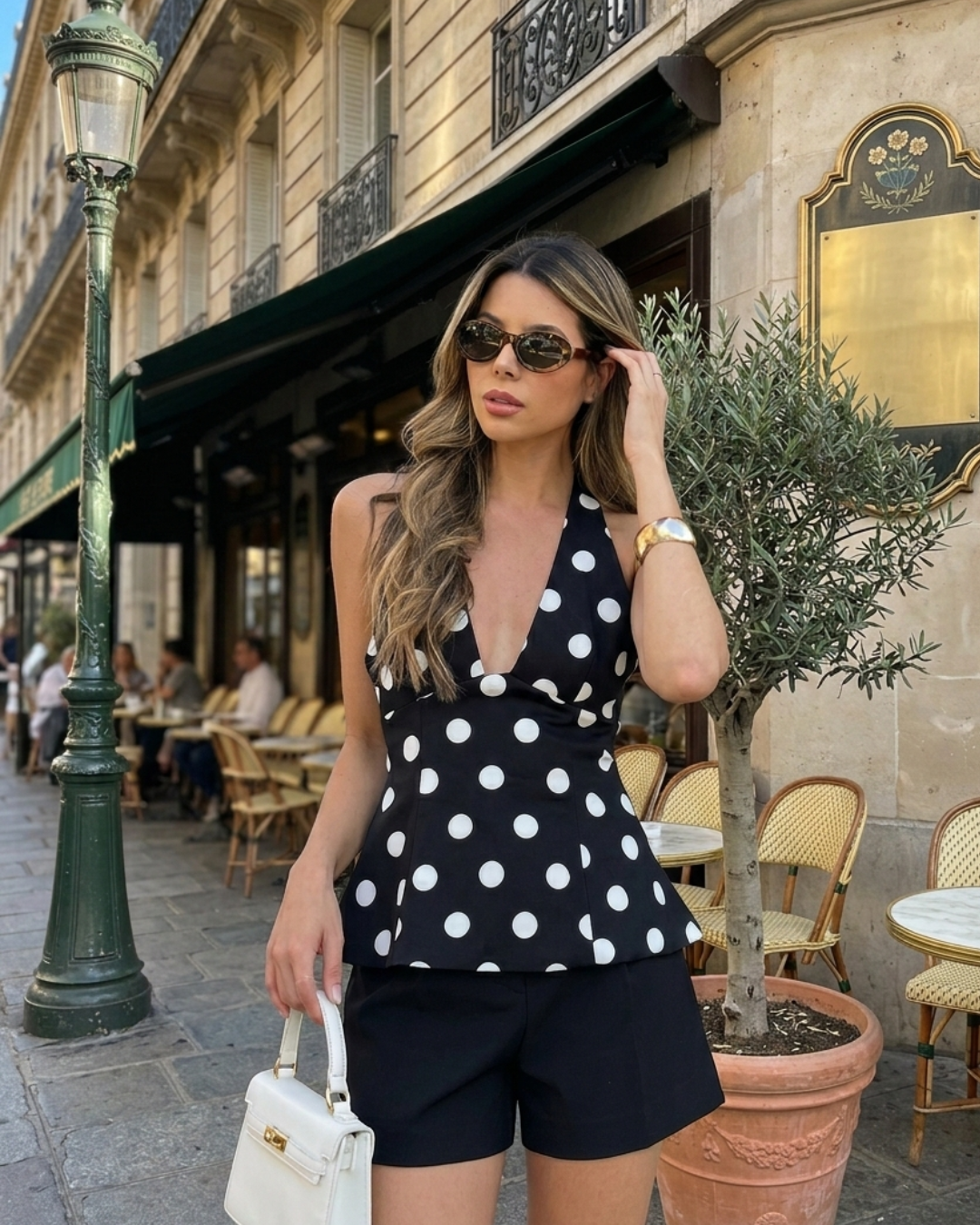 The black and white polka dot pattern delivers a retro chic aesthetic that never goes out of style. Easy to pair with high-waisted jeans, flowy skirts, or linen shorts.