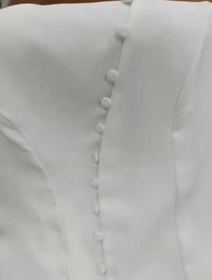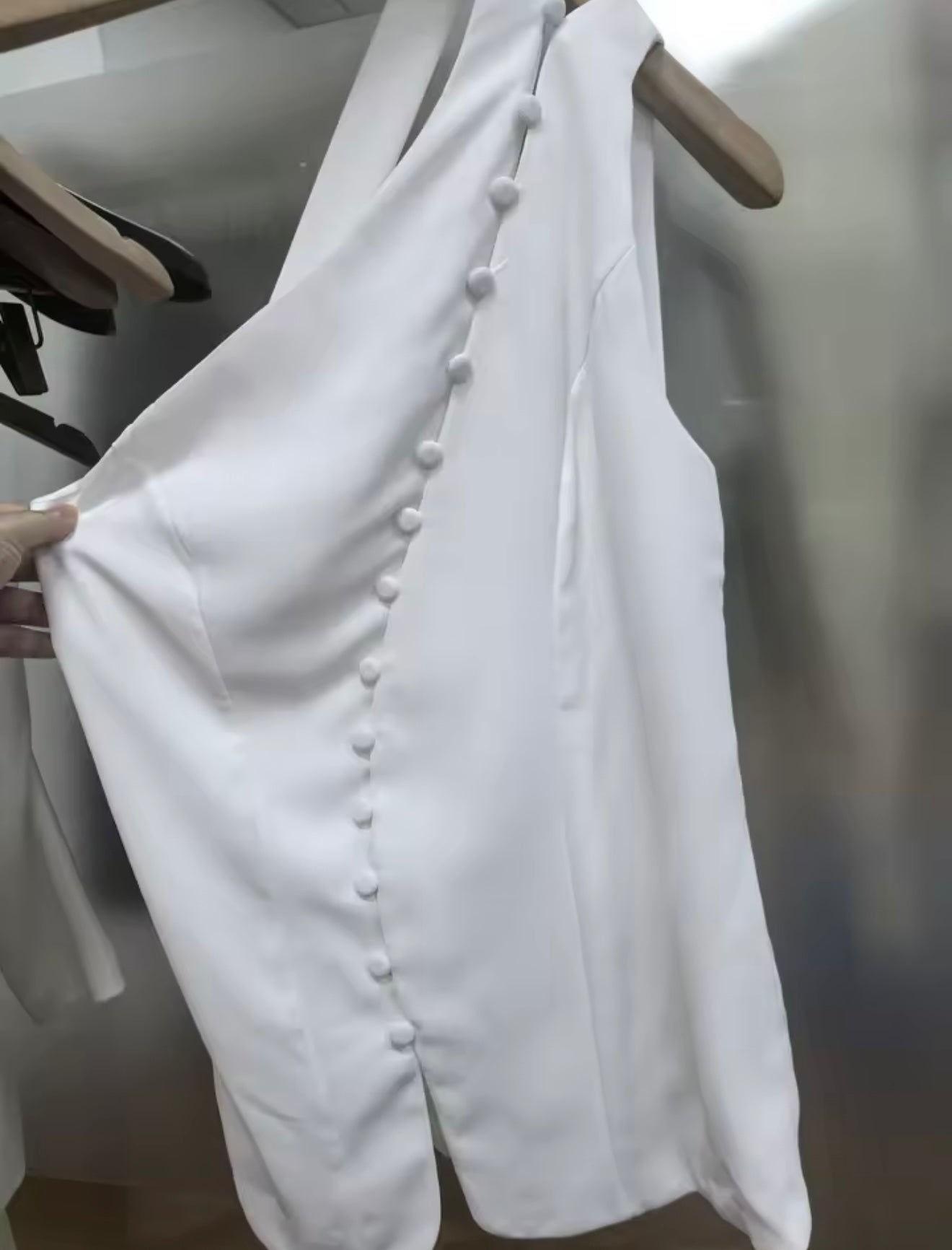 Close-up detail of white asymmetrical women’s sleeveless vest fabric and button fastening